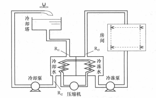 (1)制冷主機:主機部分由壓縮機、蒸發器、冷凝器及冷媒等組成,其工作循環過程如下:低壓氣態冷媒被壓縮機加壓進入冷凝器并逐漸冷凝成高壓液體,在冷凝過程中冷媒會釋放出大量熱能,這部分熱能被冷凝器中的冷卻水吸收并送到室外的冷卻塔上,最終釋放到大氣中去。制冷劑在蒸發器中迅速冷凍循環水,冷凍循環水的溫度快速降低,通過制冷主機冷凍的冷凍水由冷凍水泵送入空調房間。