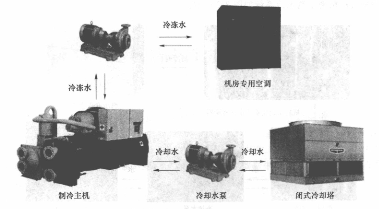 (2)冷凍水循環系統:該部分由冷凍泵冷凍水型機房空調及冷凍水管道等組成。冷凍水帶走制冷劑的冷量后,再到空調系統末端(如風機盤管,空調機組)與空氣換熱,溫度升高后再回到冷水機組內帶走制冷劑冷量,這樣構成冷凍水循環系統,在這個系統上的泵稱為冷凍水泵。從主機蒸發器流出的低溫冷凍水由冷凍泵加壓送入冷凍水管道,進入冷凍水型機房空調進行熱交換,帶走機房內的熱量,最后回到主機玉發器完成一個循環。冷凍水型機房空調用于將空氣吹過冷凍水盤管,把機房熱量帶走。
