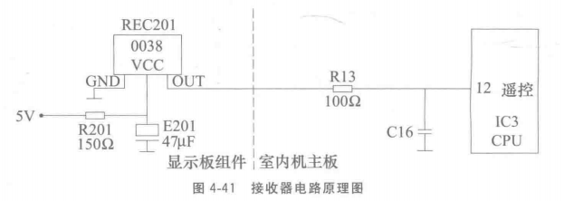 遙控接收電路原理圖見圖4-41,遙控器狀態與CPU引腳電壓的對應關系見表4-7,電路作用是接收遙控器發送的紅外線信號,處理后送至CPU引腳。