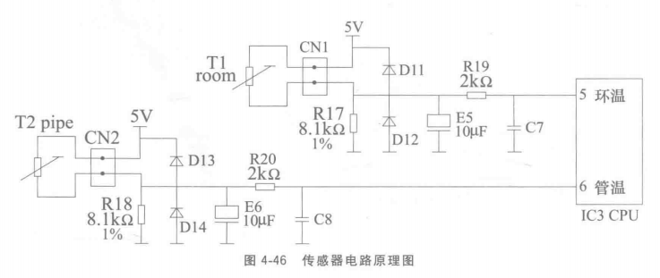環(huán)溫傳感器room、下偏置電阻R17 (8. 1Ω精密電阻)、二極管D11和D12、電解電容E5和瓷片電容C7、電阻R19, CPU⑤腳組成環(huán)溫傳感器電路;管溫傳感器pipe、下偏置電91 R18 (8. 1kΩ精密電阻)、二極管1)13和1)14、電解電容E6和瓷片C8、電阻R20, CPU⑥腳組成管溫傳感器電路。