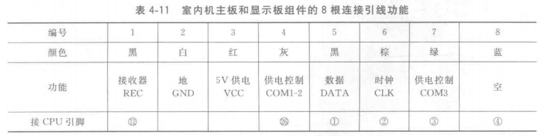 ②室內機主板和顯示板組件的8根連接引線功能 見表4-11。其中COM1-2和COM3為顯示板組件上數碼管5V供電引腳的控制引線。