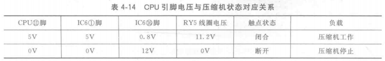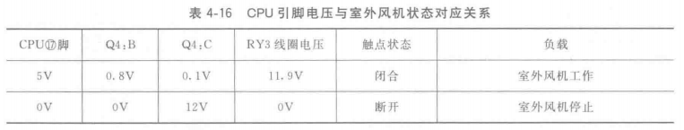 圖4-67為室外機(jī)負(fù)載驅(qū)動(dòng)電路原理圖,CPU引腳電壓與壓縮機(jī)狀態(tài)的對(duì)應(yīng)關(guān)系見表4-14。CPU引腳電壓與四通閥線圈狀態(tài)的對(duì)應(yīng)關(guān)系見表4-15。 CPU引腳電壓與室外風(fēng)機(jī)狀態(tài)的對(duì)應(yīng)關(guān)系見表4-16。