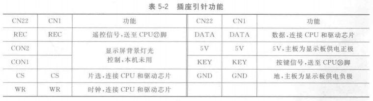 插座引針功能 室內(nèi)機(jī)主板插座代號(hào)為CN22,共有9個(gè)引針,其中有2個(gè)為空針不起作用;顯示板插座代號(hào)為CN1,共有7個(gè)引針,和CN22插座的引針一一對(duì)應(yīng)。引針功能見表5-2。