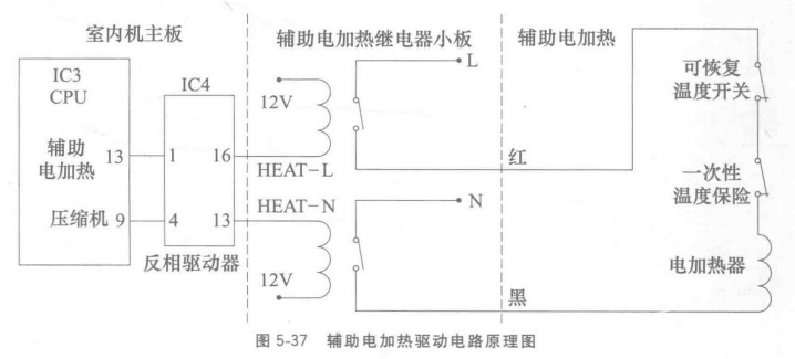 當(dāng)CPU接收到遙控器“輔助電加熱開啟”的信號或其他原因,需要控制輔助電加熱開啟時,?腳變?yōu)楦唠娖?/span>5V,送到反相驅(qū)動器IC4的①腳輸入端,其對應(yīng)輸出端?腳為低電平約0.8V, L端繼電器線圈電壓約為直流11. 2V,產(chǎn)生電磁吸力使觸點閉合,接通L端電壓,經(jīng)可恢復(fù)溫度開關(guān)、一次性溫度保險、電加熱器與N端電源組成回路,輔助電加熱開始工作;當(dāng)CPU需要控制輔助電加熱停止工作時,?腳變?yōu)榈碗娖?V,使得L端繼電器觸點斷開,輔助電加熱停止工作;在某種特定悄況如“制熱防過載保護”,CPU控制壓縮機停機時,輔助電加熱也同時停止工作。