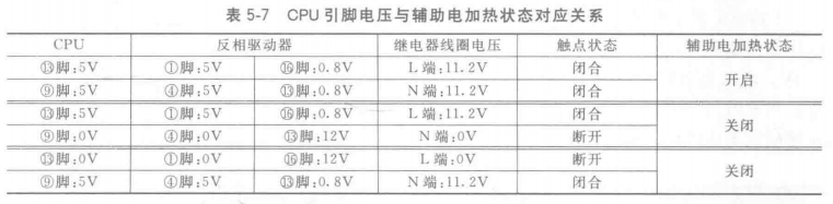 輔助電加熱驅(qū)動電路原理圖見圖5-37,CPU引腳電壓與輔助電加熱狀態(tài)對應(yīng)關(guān)系見表5-7。