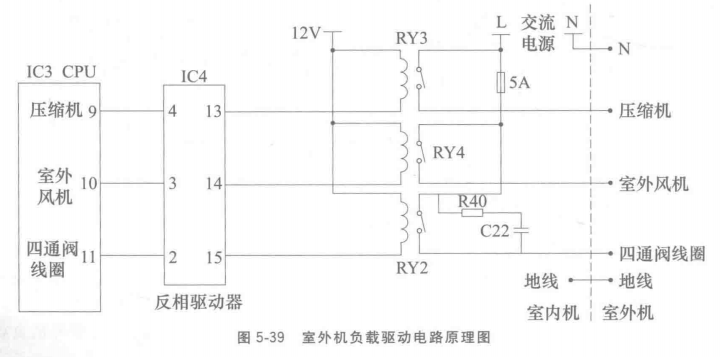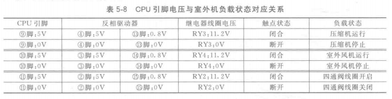 室外機負載驅動電路原理圖見圖5-39, CPU引腳電壓與室外機負載狀態的對應關系見表5-8。