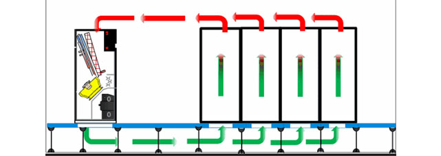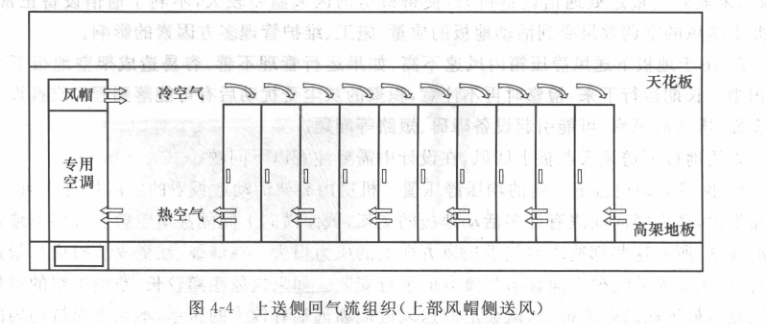 對于機房無防靜電地板或防靜電地板高度過低(<150mm)時,或機房防靜電地板下部有過多障礙物(如通信線槽等)妨礙通風時,可考慮選用上送風機組。上送風方式是把空調機組處理過的低溫空氣通過送風口送到通信設備上部,帶走通信設備和機房的熱量,通過機房下部回風區域(一般在側墻上安裝回風口)回到空調機組內,進行冷卻降溫處理,再循環使用。上送風分為兩種形式,即風帽送風和風道送風。