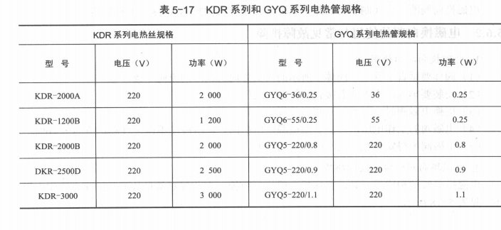 處理方法:對于化霜加熱器、防凍加熱器的電阻絲燒斷,由于他們都是被發(fā)泡在箱體內(nèi),因此損壞后一般不能修理。對于補償電加熱器、裸線式加熱器或電熱管加熱管燒斷,則可調(diào)換相通規(guī)格的電阻絲,為了便于選用KDR系列和GYQ系列電熱管規(guī)格,特列表5-17