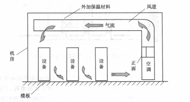 風(fēng)道式送風(fēng)就是空氣經(jīng)專(zhuān)用空調(diào)處理后,經(jīng)由靜壓箱、支風(fēng)道、出風(fēng)口,送至通信設(shè)備機(jī)柜前,直接降低設(shè)備及周?chē)h(huán)境溫度。如圖4-6所示。風(fēng)管上送風(fēng)工程造價(jià)高于風(fēng)帽送風(fēng)方式,安裝及維護(hù)也較為復(fù)雜。在風(fēng)帽上送風(fēng)無(wú)法滿足送風(fēng)距離,空調(diào)房間又要求各處空調(diào)效果均勻的場(chǎng)所,一般推薦采用此種送風(fēng)方式機(jī)型。這種送風(fēng)方式有著風(fēng)帽送風(fēng)不可比擬的優(yōu)勢(shì):