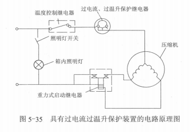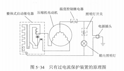直冷式單門冰箱的控制線路一般由壓縮機電動機的起動、保護控制和門燈照明控制二個回路組成。他們之間的連接關(guān)系是并聯(lián)的,整機的電路除上述兩個回路外,無其他附設(shè)電氣裝置。