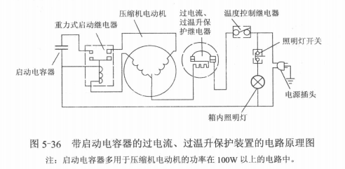 3、圖5-36所示,是帶啟動電容器的過電流、過溫升保護裝置的電路原理。