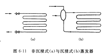 盤管式蒸發器又可分為沉浸式與非沉浸式兩大類,圖6-11的(a)和(b)是它們的示意圖。