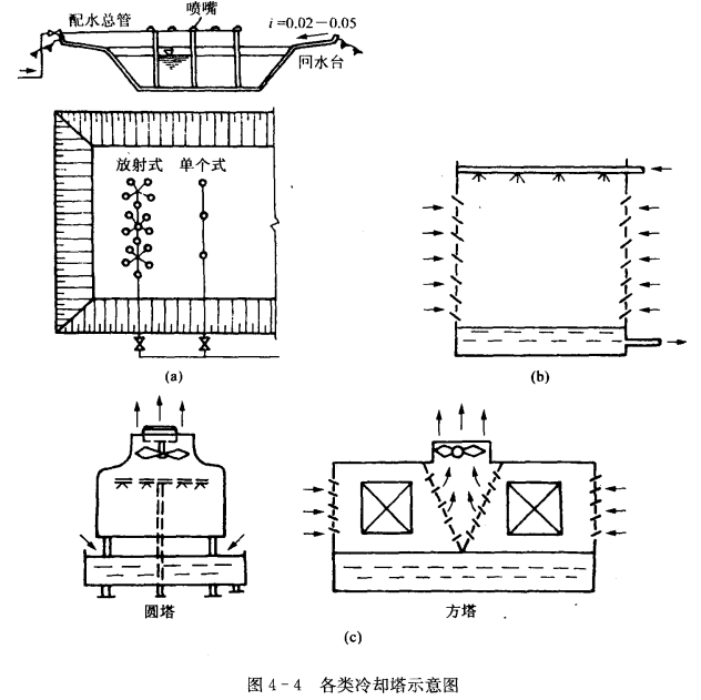 ③機械通風冷卻塔。對于機械通風冷卻塔,按空氣流向不同,又可分為橫流式與逆流式兩種。見圖4-4(c)。
