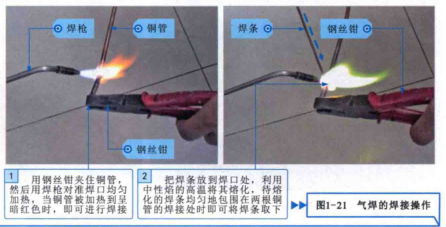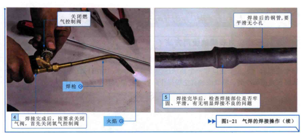 調整好焊槍的火焰后,焊接操作如圖1-21所示。在焊接操作時,要確保對焊口處均勻加熱,絕對不允許使用焊槍的火焰對管路的某一部件長時間加熱,否則會燒壞管路。通常,關火順序為:先關閉焊槍上的氧氣控制閥門,然后關閉焊槍上的燃氣控制閥門,若長時間不再使用,還應最后關閉氧氣瓶和燃氣瓶上的閥門,關火順序不可相反,否則會引起回火現象,發出很大的啪啪聲。