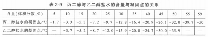 2)丙二醇(CH2OH·CHOH·CH3)。它與乙二醇相同,也是無色、無味、無電解性的溶液。丙二醇是無毒的,是極穩定的化合物,可與食品直接接觸而不會引起污染。因此一些接觸式凍結食品裝置中,采用丙二醇為載冷劑。丙二醇與乙二醇鹽水的含量與凝固點的關系見表2-9。