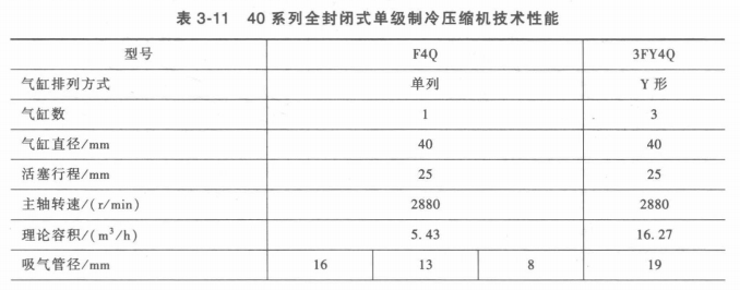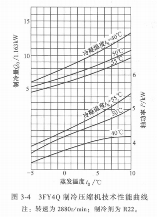 40系列全封閉式制冷壓縮機目前只有1缸、3缸兩種產品。產品以壓縮冷凝機組形式或整體制冷裝置(如冰箱、低溫箱及空調機等)形式出廠。壓縮機的技術性能見表3-11,性能曲線如圖3-4所示。