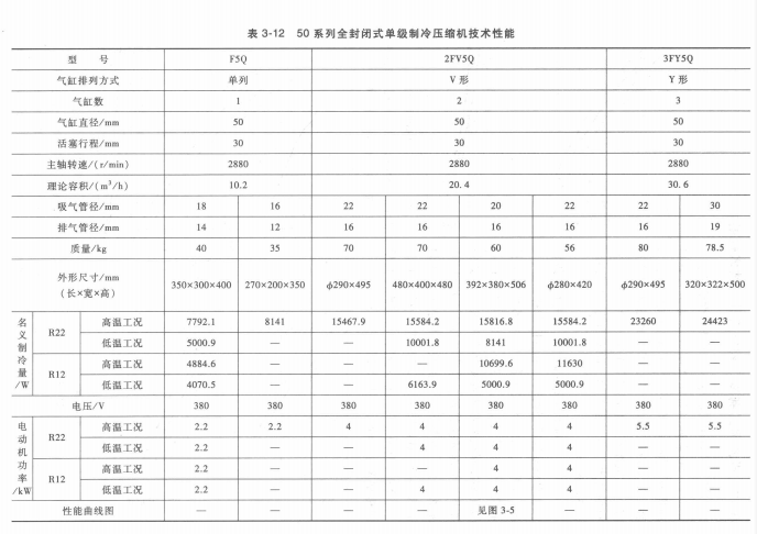 50系列全封閉式制冷壓縮機只有單級機型。品種有1缸、2缸、3缸3種。產品以壓縮冷凝機組形式或整體制冷裝置(如冰箱、空調機等)形式出廠。壓縮機的技術性能見表3-12,性能曲線如圖3-5所示。