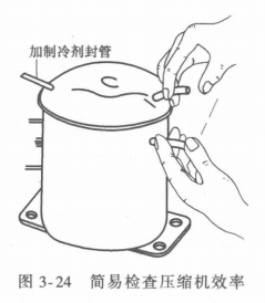 檢查壓縮機效率 若加制冷劑無效,可將制冷劑抽出(另用壓縮機抽),割斷泵殼上的吸排氣管,然后接電源運轉(zhuǎn),用手指按住排氣管讓壓縮機壓氣。當(dāng)壓氣至手指按不住時,再用手指按住吸氣管感覺有吸力,一般認為壓縮機是可以用的,如圖3-24所示。