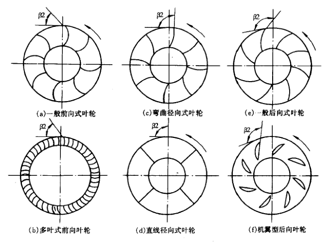 離心式通風機的葉輪一般由鍍鋅薄板、薄鋁板或工程塑料制成,直徑較大而生產(chǎn)量小的葉輪用鍍鋅鋼板制造,直徑小的葉輪用鋁板沖壓或用工程塑料壓鑄成型。葉輪形式通常有后向式、前向式和徑向式三種,如圖2-32所示。