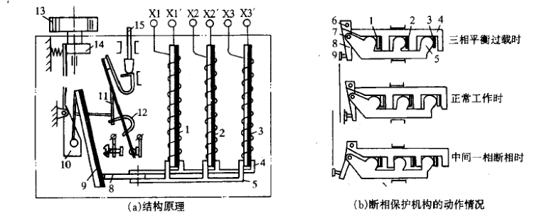圖2-44為JR16-20/3D型三相結構帶斷相保護裝置的熱繼電器的結構原理圖。它除有三個熱元件外,還裝有由內外導板4、5,鉸鏈6、7和杠桿8所組成的差動斷相保護機構。電動機在三相平衡過載時,三組雙金屬片1~3同時受熱彎曲。通過外導板5和杠桿8,推動觸點機構動作。這時內導板4由杠桿8帶動,也隨外導板一起移動。如果有一相斷線,例如中間的一相斷線時,該相的雙金屬片2即因熱元件的斷電而逐漸冷卻,使內導板向右移動,其余的兩相金屬片仍在受熱彎曲,使外導板繼續向右移動,這時,杠桿8上的鉸鏈6和7將由內外導板帶動向相反的方向移動,因此通過杠桿8的放大作用,將大大加快觸點機構大動作,使斷相運行得到及時制止。