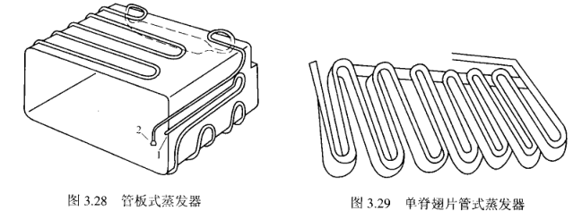 (2)管板式。管板式蒸發器的結構如圖3.28所示,它是將蒸發盤管粘附于長方盒殼板外表面上制成的。通常有鋼管一一鋁板式、異形鋁管一一鋁板式等。若用作冷藏室的蒸發器,則還有銅管一一鋼板、異形鋼管一一塑料內膽等結構。由于這種蒸發器的制造工藝,不易破損,即使內壁破損也不會導致制冷泄漏,因而現在生產的直冷式冰箱較多采用這種方式。它的缺點是為避免壓力損失太大,盤管的長度受到一定的限制,而且管道的間距較大,管道與壁板之間溫差比較大,央此傳熱效率較低。
