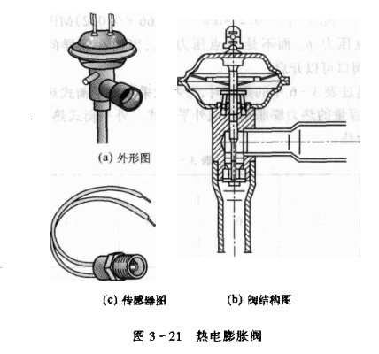 制冷雙金屬片型熱電膨脹閥閥由傳感元件和調(diào)節(jié)閥組成,如圖3-21所示。調(diào)節(jié)閥的主要部分有:電熱式閥頭、針閥和閥座。閥頭中沒(méi)電加熱器和雙金屬片,電加熱器對(duì)雙金屬片加熱,使后者產(chǎn)生彎曲變形.帶動(dòng)針閥動(dòng)作。調(diào)節(jié)間的開(kāi)度取決于加給閥加熱器上的電壓,電壓升高時(shí),閥開(kāi)大,流量增加;反之,閥關(guān)小,流量減少。