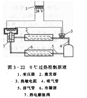 0℃過(guò)熱控制原理:熱電膨脹閥對(duì)制冷劑流量的調(diào)節(jié),能夠使得在任何負(fù)荷下制冷劑在蒸發(fā)器出口都處于飽和蒸氣狀態(tài),而在吸氣管中過(guò)熱(防止壓縮機(jī)液擊)。其控制原理如圖3-22所示。將一只負(fù)溫度系數(shù)的熱敏電阻申接在閥加熱器的電路中。電路中的電流是熱敏電阻阻值的函數(shù),而后者又是熱敏電阻所在處制冷劑狀態(tài)的函數(shù)。將熱敏電阻置于6mnm左右的短管中.并封裝在蒸發(fā)器出口的回氣管上,熱敏電阻暴露于制冷刑。當(dāng)蒸發(fā)器出口為過(guò)熱蒸氣作用于它時(shí).由子通電加熱作用,熱敏電阻盆度升高,電阻值下降,回路中電流增大.閥加熱器上的電壓升高將閥開(kāi)大,制冷劑流金增加。這個(gè)過(guò)程一直要持續(xù)到蒸發(fā)器出口處不再是飽和態(tài)。制冷劑液滴或濕蒸氣接觸到熱敏電阻.使之冷卻,熱敏電阻的限值升高.閥又開(kāi)始關(guān)小。最終的結(jié)果是將閥穩(wěn)定在蒸發(fā)器出口為飽和蒸氣態(tài)所對(duì)應(yīng)的開(kāi)度上。無(wú)論蒸發(fā)器負(fù)荷如何變化,制冷劑在蒸發(fā)器出口處的狀態(tài)特征不變,任何因素(比如燕發(fā)器側(cè)的壓力降)都不會(huì)改變閥的過(guò)熱控制。因此,保證了蒸發(fā)器面積充分利用。與熱力膨脹閱相比,熱電膨脹閥可以將制冷系統(tǒng)的能力提高10%以上。