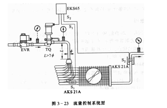 流量調節裝置由熱電式膨脹閥即執行器(圖中的TQ)、電子調節器(圖中的EKS65)和傳感器(兩個AKS21A)組成。傳感器AKS由2只1000iE的鉑電阻組成,它們分別感應蒸發器入口處和出口處的制冷劑溫度,將相應的感溫信號S2和S1輸人到電子調節器EKS65,調節器