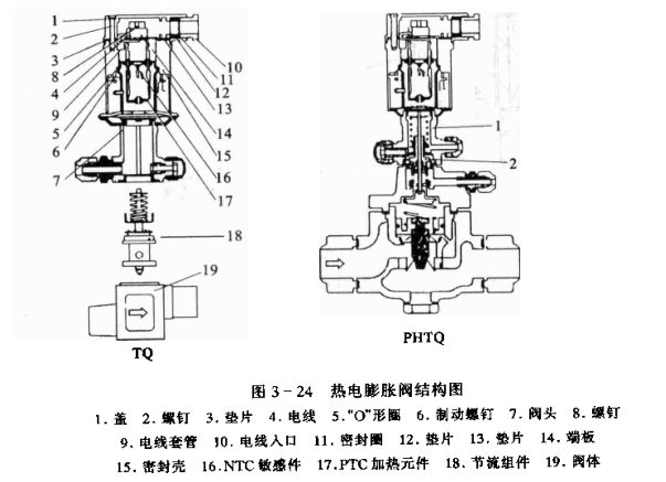 閥執行器結構如圖3一24所示。閱的動力件是個特制的膜頭,其中充入一定的介質,加熱元件對介質加熱。調節器輸入到執行器的電脈沖數的變化,可以改變加熱元件對膜頭中介質的加熱程度,使介質沮度變化,輸出相應的壓力變化.通過膜片作用于閥桿,實現流量調節。執行器作成通用型可以與不同的閥體組合.小型的直接驅動(如圖中的TQ);大型的作成導閥與主閥組合式(如圖中的PHTQ),間接驅動。