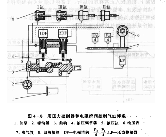 圖4一8所示為一臺八缸壓縮機采用壓力控制器和電磁滑悶控制氣缸卻載的原理。壓縮機的8個氣缸中,安排4個氣缸作基本工作缸(圖中的I.II),另外4個缸作調節缸,每次上載兩缸(圖中的III1組和IV組缸),使壓縮機能量分為三級:1/2,3/4和4/4.調節缸的卸載機構受油壓驅動。當油壓作用于卸載機構的油缸時,氣缸正常工作(上載);當油壓消失時,卸載機構上的頂桿將吸氣閥片頂開,不能蓋住吸氣孔,氣缸因失去壓縮作用而卸載。