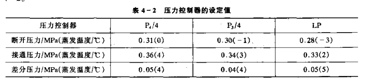 能量調節方法為:用壓力控制器LP控制壓縮機電動機;用壓力控制器P?/4控制第III組氣缸卸載機構油路管上的電磁滑閥1DF;用壓力控制器P?/4控制第IV組氣缸卸載機構油路管上的電磁滑閥2DF。例如,采用R12制冷劑,額定蒸發溫度為5℃,上述3只壓力控制器的設定值見表4一2。