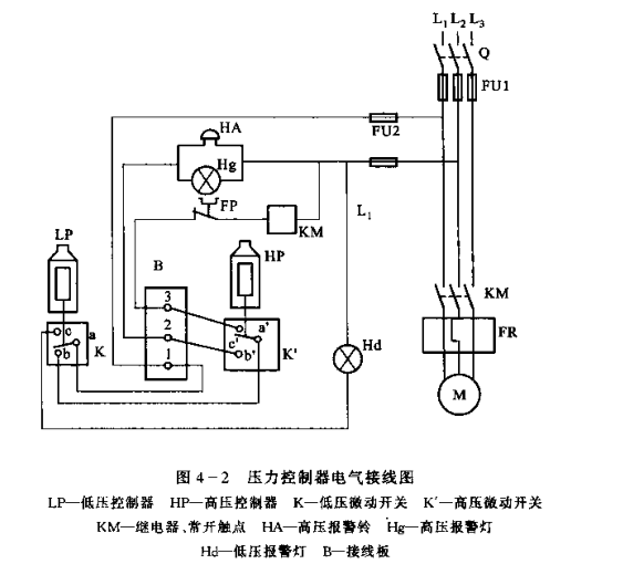 壓力控制器電氣控制接線如圖4-2所示。壓力控制器實質上是一種由壓力來控制的電開關。其電氣控制的過程為:當壓縮機吸氣壓力低于設定的安全值時,徽動開關K的觸點b與.點斷開。繼電器線圈KM失電,由其所控制的壓縮機電動機主線路上常開觸點KM斷開,壓縮機主電路失電停機。開關K的c觸點與a觸點接通,低壓報警燈Hd亮。