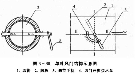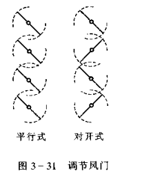 空調系統中,為了維持溫度或風壓等參數,常用調節風門來調節空氣流量。風管或風道中應用的調節風門大多是多葉式。多葉式風門有兩種形式.即平行式和對開式。如圖3一31所示。平行式風門的所有葉片都同方向轉動,對開式風門的調節性能比平行式的較好。