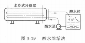 1.酸洗法:以水冷式冷凝器為例。先準備好耐酸腐蝕的水箱、水泵、水管、接頭等,參看圖3-29,即可進行操作。