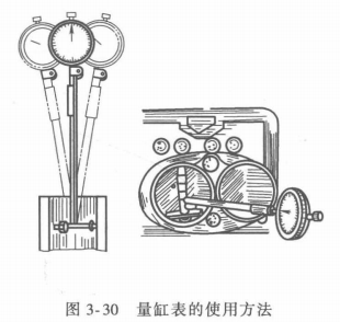 3.測量氣缸套磨損量:測量氣缸套磨損時(shí)使用量缸表,量缸表(千分表裝置在T形支架上)的具體使用方法如圖3-30所示。或用內(nèi)徑千分尺測量氣缸套的磨損數(shù)值,如系列12.5制冷壓縮機(jī)用100~160mm規(guī)格的量缸表,或用內(nèi)徑千分尺(規(guī)格是125~150mm ),在氣缸套內(nèi)徑上、中、下三個(gè)部位交叉進(jìn)行多次測量,檢查氣缸內(nèi)表面的磨損數(shù)值。