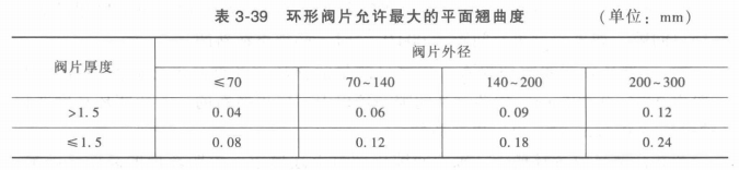 閥片的損壞往往是被擊碎,這與閥片的材質有很大關系。對閥片的要求是:表面不應有裂痕和斑點,閥片接觸密封面的粗糙度值為RaO. 4μm,其余為Ra1.6μm,閥片允許最大的平面翹曲度見表3-39。