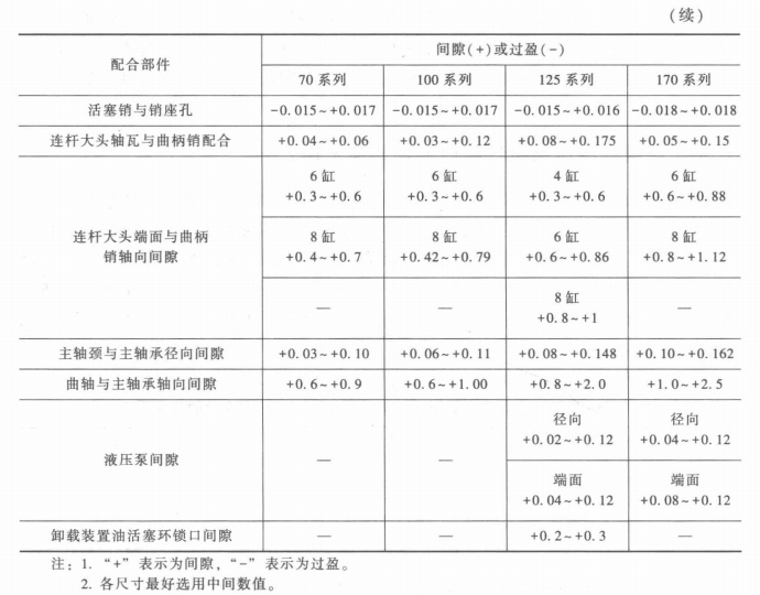 活塞銷與小頭襯套的徑向間隙:襯套內孔直徑40 - 50mm,間隙為0.035mm ;直徑60mm,間隙為0.05~0.07mm。接觸應均勻,接觸包角為60°~70°,小頭襯套的磨損量達0. 1mm時,應予更換。