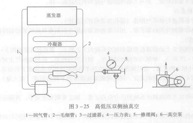 4) 用軟管將壓縮機、干燥過濾器修理閥與真空泵并聯(lián)在一起,其連接方法如圖3-25所示。