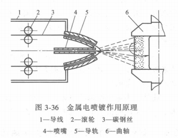 曲軸的曲柄銷磨損比主軸頸大,當磨損達到1mm以上或拉痕很深時,可以進行鍍鉻或噴鍍方法處理,然后再上曲軸磨床磨削。金屬電噴鉸方法,是利用兩根碳鋼絲通電產生電弧,碳鋼熔化后被壓縮空氣吹成金屬微拉,噴射到旋轉的曲軸軸頸表面上,從而形成噴鍍層,如圖3-36所示。