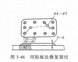 貼板法。將裂紋兩端鉆4 ~ 5mm的孔,防止裂紋伸長。配制超過裂紋邊緣15~25mm的鋼板,并將鋼板與裂紋處加工貼合緊密。在鋼板和機體上每隔20 ~25mm處鉆孔,用絲錐攻螺紋,墊上耐油石棉橡膠板,紙板涂上鉛油,用螺釘擰緊在機體上,如圖3-46所示。