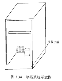 由于電冰箱內(nèi)、外有很大的溫差,在箱體內(nèi)外殼結(jié)合部形成“冷橋",再加上電冰箱門封的隔熱性能較差,使電冰箱門體周圍的溫度降低。若其溫度降到空氣溫度相對的露點溫度時,即出現(xiàn)凝露現(xiàn)象。這不但給用戶造成麻煩,而且還對箱體產(chǎn)生銹蝕作用。為防止凝露、降低能耗,采用了熱管防露系統(tǒng)。它是將壓縮機排出的高壓過熱蒸氣經(jīng)過電冰箱門體周邊的除霜管后,再進(jìn)入冷凝器。這樣可以利用部分熱量使電冰箱門體周邊的表面溫度稍高于或接近環(huán)境溫度,從而達(dá)到了防凝露的目的。這種結(jié)構(gòu)不但可以防止凝凝,而且兼有冷凝散熱的作用。除霜系統(tǒng)示意圖如圖3.34所示。
