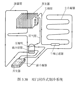 圖3.38是雙門間冷式電冰箱的制冷系統流程圖。這種冰箱只設一個翅片式蒸發器,設有主、副兩個冷凝器,副冷凝器兼作融霜水蒸發器的加熱管。有些設有壓縮機機油冷卻管,有些不設。圖3.38為帶除露、油冷卻和融霜水自動蒸發的系統。系統中制冷劑的流向是: