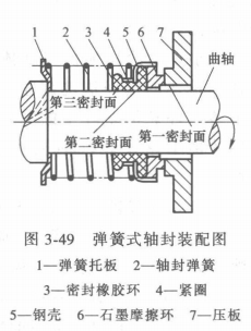 裝軸封 先將外彈圈套在固定環(huán)上,裝入軸封蓋,密封面要平整.然后將彈簧、壓圈、內(nèi)彈性圈及活動(dòng)環(huán)裝入,再將軸封蓋慢慢推進(jìn),使定環(huán)與活動(dòng)環(huán)的密封面對(duì)正,以松手后能自動(dòng)而緩慢地彈出為宜。若推進(jìn)去后松手根本不動(dòng),則過(guò)緊;若很快彈出,則證明太松。過(guò)松或過(guò)緊原因主要是:橡皮圈和上面墊圈松緊度不適宜,可用紙墊作適當(dāng)?shù)恼{(diào)整,也可更換橡皮圈或緊圈直到正常為止,再均勻地?cái)Q緊螺栓。否則會(huì)導(dǎo)致軸封泄漏。彈簧式軸封裝配如圖3-49所示。