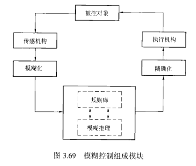 在實際控制中,由傳感裝置檢測得到的是精確量,而不是模糊量。這些精確量要變成模糊量才能進行推理,這叫模糊化。此外,模糊推理出來的結果,也就是模糊集,它是無法實際執行的。傳輸到操作系統執行的也是精確量。因此,要將推理結果的模糊集轉換成精量,這個過程叫精確化,也被稱為去模糊或反模糊。因此,模糊控制是由圖3.69所示的模塊組成的。