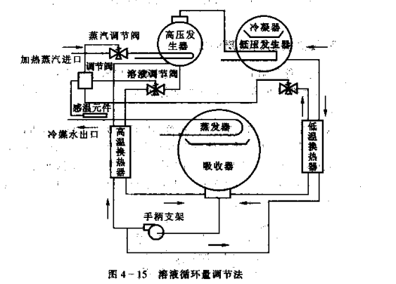 圖4一15所示為將調節閥裝在高、低壓發生器稀溶液進口管道上.當外界負荷降低時.蒸發器出口冷媒水溫度降低感溫元件發出信號通過調節器和執行機構.使調節閥的開度改變.減少進入高、低壓發生器的稀溶液量,使制冷量下降.蒸發器出口冷媒水回升。