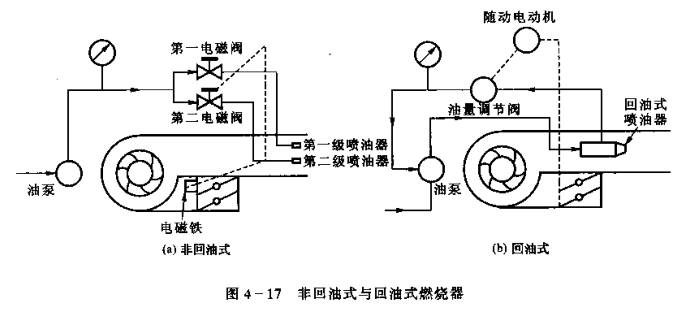 燃油量的調(diào)節(jié)方法分非回油式與回油式兩種。如圖4一17所示。非回油式的油量調(diào)節(jié)范圍很小一般采用開關(guān)控制或設(shè)置多個(gè)噴嘴。回油式調(diào)節(jié)范圍比較大,多余的油料可以通過油量調(diào)節(jié)閥回流,從而保證在燃油壓力變化不大的情況下,銀據(jù)負(fù)荷來調(diào)節(jié)燃燒的油量。無論是何種調(diào)節(jié)方法,油量潤節(jié)的同時(shí)必須對空氣量進(jìn)行調(diào)節(jié)。