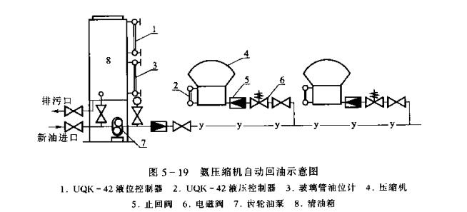 制冷壓縮機(jī)加油的自動(dòng)控制可采用UQK-42型液位控制器實(shí)現(xiàn)。自動(dòng)加油回路如圖5-19所示。