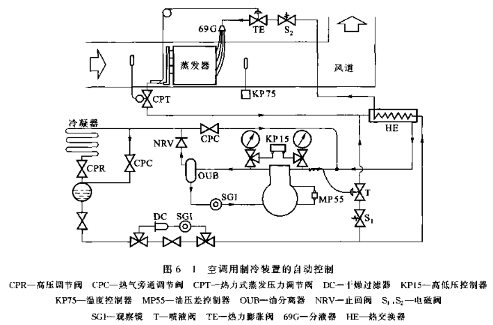 圖6一l所示為一個(gè)全年性運(yùn)行的空調(diào)用制冷系統(tǒng)及自控實(shí)例。它用一臺無卸載機(jī)構(gòu)的中型壓縮機(jī)供冷,風(fēng)冷式冷凝器置于室外,冷凝器風(fēng)機(jī)不變速。這種系統(tǒng)常見于中、小型公共場所的空氣調(diào)節(jié)機(jī)組。其自控系統(tǒng)有以下特點(diǎn)。