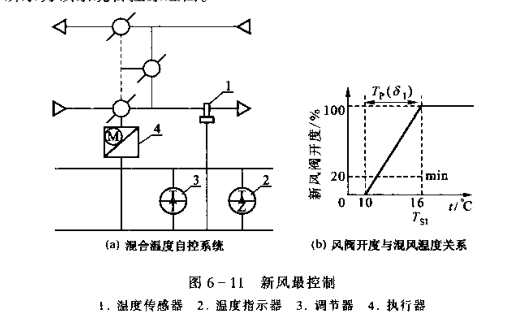 在冬季.當混合沮度低于給定值T,時,根據混風泥度,按調節器的比例控制風門開度。混風溫度升高,新風閥門開大。當棍風N度達到給定值T,時.新風閥門全開.取最大新風量。最小新風閥門位置也是可調的.如20%。風門位置與混風沮度之間的關系如圖6一11(b)所示。圖中Tr (81 )是混風調節器的比例范圍。在此范圍內,新風閥位與棍風沮度成比例關系。當t>Ts?時,進入過渡季節。Ts?是給定調整點,為16 ℃ ,而比例范圍Tp為6℃。