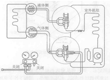 經檢查,如果有泄漏之處,則用扳手進一步將該處擰緊,直至無泄漏。然后用六角扳手推三向閥輔助口上的銷子3s,并打開閥門約1min,將空氣排除。確認已無漏氣現象存在,即可進行壓力檢測,如下圖所示。具體方法是:打開雙向閥和三向閥,使機組處于運轉狀態。此時檢查左側管子是否漏氣,并將漏氣檢測表接到三向閥的輔助口,測量其壓力,此過程應保持5~10min,以確保其準確性。